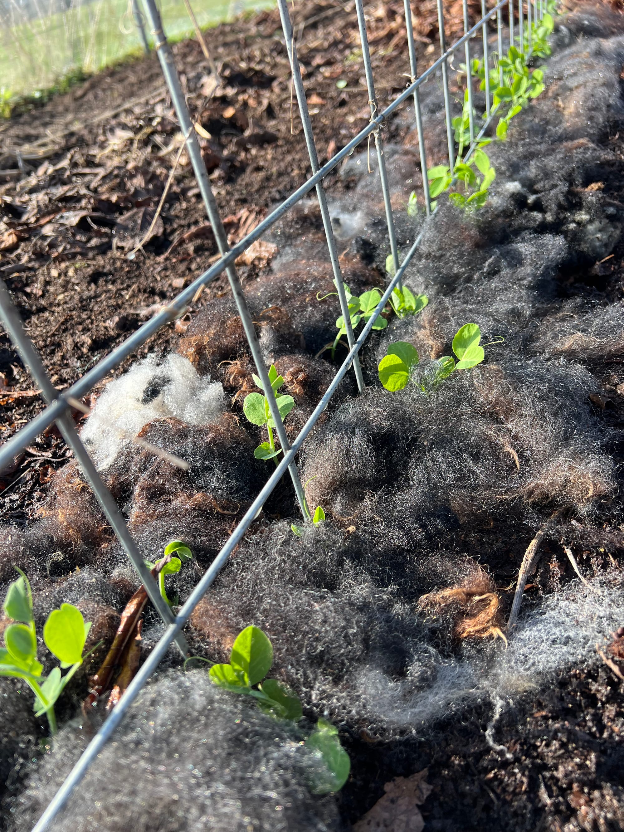 De sugar snaps heb ik vrijdag ingeplant, langs een tweede rek. In een dubbele rij. Want ook hier werkte “doe meer met ongeveer” wat matigjes. De doperwten zijn een kleine soort en die heb ik langs een laag rekje geplant, in dubbele rijen. Met 80 doperwt planten (een handje zal wel ongeveer goed zijn...) zullen we toch over een paar maanden wel een keer doperwten kunnen oogsten in de tuin! Ik heb alle plantjes lekker ingestopt in een laagje wol. De wol beschermt de planten tegen uitdroging en hopelijk tegen slakken, de eerste ben ik al weer tegen gekomen, kruipend over de bodem.