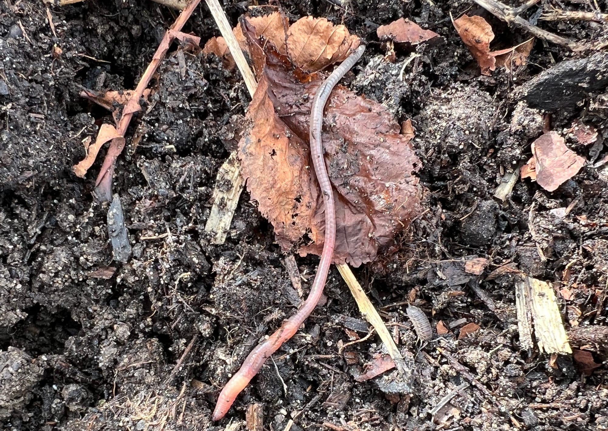 Toch heb ik dat niet gedaan en ik heb er geen spijt van (alhoewel, dat kleien: gemiste kans). We hebben vorig voorjaar een laag karton en 10 cm compost op de aarde verspreid en in de herfst heb ik het afgedekt met bladeren. Vooral op de plekken waar we vorig jaar ook niet liepen (ik heb de indeling van de bedden wat veranderd) is het echt mooie grond geworden, vol leven. Ik blijf het afdekken, hopelijk houdt dat de aarde zo mooi zwart en rul en krioelend van het bodemleven.